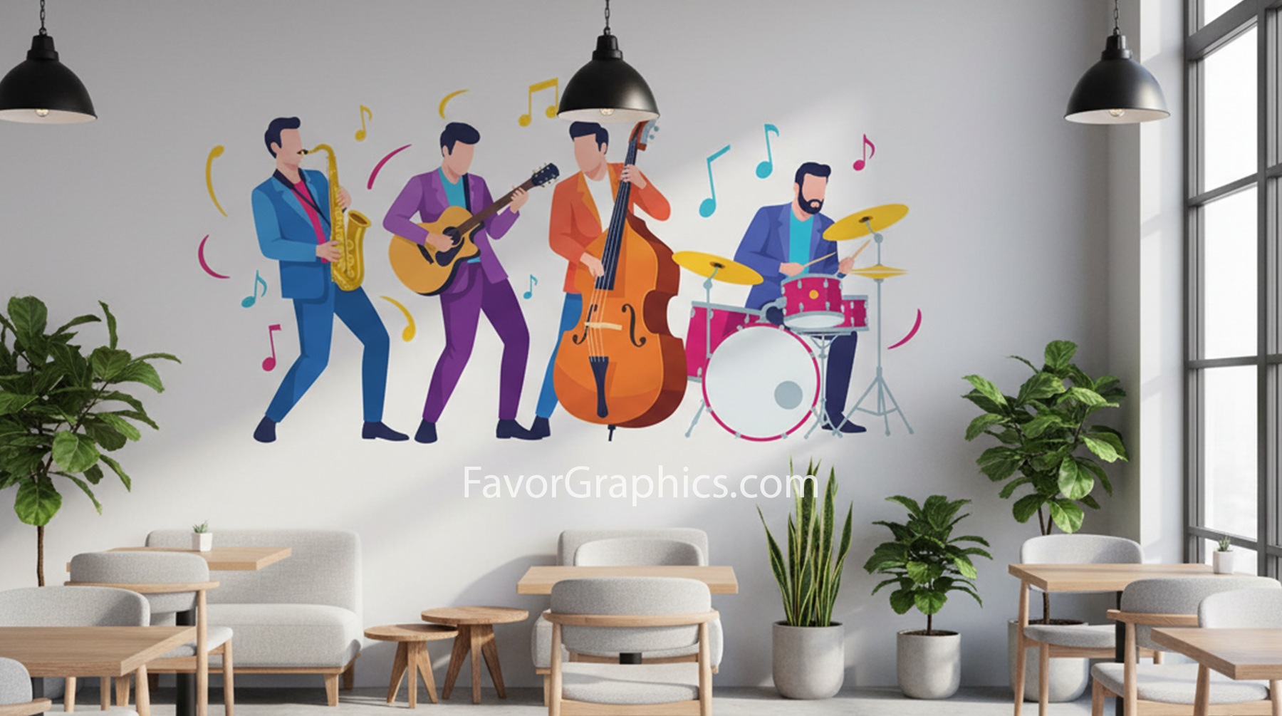 Bring rhythm and soul to your space with this Jazz Band Wall Mural Decal! Featuring a dynamic illustration of four musicians playing saxophone, guitar, double bass, and drums, this mural adds a lively, artistic vibe to any wall. Surrounded by musical notes and abstract shapes, it’s perfect for creating a creative, welcoming atmosphere.